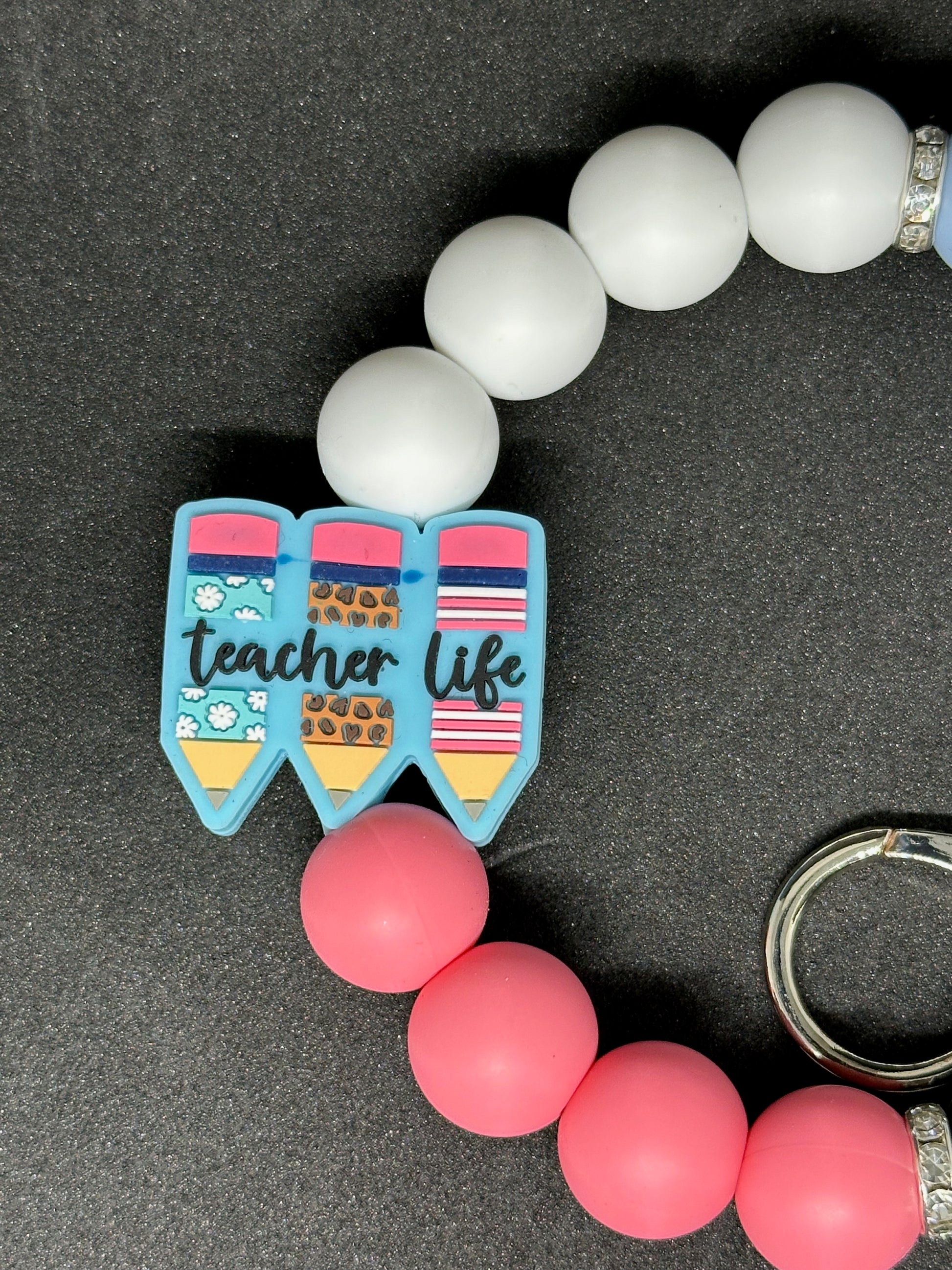 "Get a grip on your teacher life with this durable wristlet! Perfect for holding your keys, IDs, and more with its handmade design. Multi purpose and stylish, this key chain holder adds a touch of fun to your daily hustle. (Teacher puns not included.)"